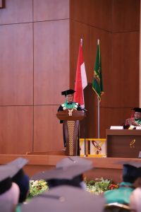 Sementara itu, Staf Ahli Gubernur Banten, Zaenal Mutaqin, S.E., M.SE., M.Sc., Ph.D., yang hadir mewakili Gubernur Banten, menyampaikan bahwa wisuda adalah momen proklamasi kesiapan untuk mengabdi. Zaenal mengingatkan bahwa para lulusan tidak lulus di masa yang biasa-biasa saja, melainkan di tengah guncangan geopolitik dan ketidakpastian ekonomi global.
