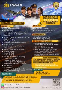Adapun syarat utama yang harus dipenuhi pelamar meliputi standar IPK minimal 3,0 dengan program studi yang terakreditasi minimal B. Batasan usia ditentukan berdasarkan jenjang pendidikan, di mana usia maksimal bagi lulusan S-1 adalah 26 tahun, S-1 Profesi 28 tahun, S-2 30 tahun, dan Dokter Spesialis hingga 40 tahun. Selain kualifikasi akademik, calon siswa harus memenuhi syarat tinggi badan minimal, yaitu 162 cm untuk pria dan 157 cm untuk wanita. Masyarakat yang membutuhkan informasi lebih lanjut dapat menghubungi kanal resmi Polda Banten melalui WhatsApp atau media sosial yang tertera pada pengumuman tersebut.