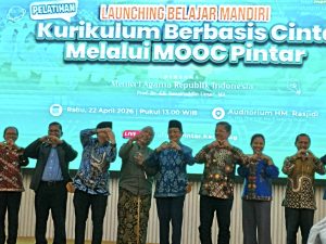 HumasUIN – Menteri Agama meluncurkan program belajar mandiri Kurikulum Berbasis Cinta (KBC) melalui platform MOOC Pintar di Aula H. Rasyidi, Kementerian Agama RI, Jalan MH Thamrin, Jakarta, Rabu (22/4/2026). Peluncuran ini menjadi bagian dari upaya penguatan pendidikan keagamaan yang menekankan nilai kasih sayang, penghormatan antarsesama, dan kepedulian terhadap lingkungan.